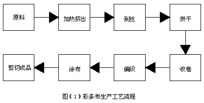 塑料彩條布主要是以丙烯、聚乙烯為原料,經(jīng)螺桿擠出機(jī)擠出成塑料薄膜,塑料薄膜經(jīng)刮絲、加熱牽伸、回縮定型后由收卷機(jī)收卷成錠子,通過圓織機(jī)將絲線編織成彩條胚布后,送涂膜機(jī)進(jìn)上膠涂覆處理,以提高塑料彩條布的強(qiáng)度、耐磨性和防水性能,其生產(chǎn)工藝流程如圖(1)示: