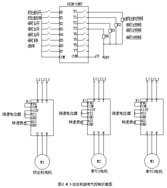 平膜拉絲機(jī)組中,擠出機(jī)及牽引裝置均采用PLC+變頻器的控制方式。其中,PLC采用三菱FX2N-32MT,變頻器選用奕創(chuàng)飛ECF100-G系列,具體型號(hào)見表(1)。圖(4)給出了拉絲機(jī)組的電氣控制示意圖。