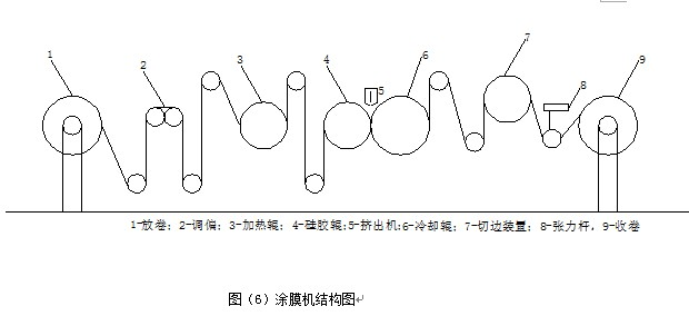 涂膜機(jī)主要由放卷裝置、調(diào)偏裝置、擠壓裝置、擠出機(jī)、冷卻裝置、切邊和收卷裝置等構(gòu)成,結(jié)構(gòu)圖如下。