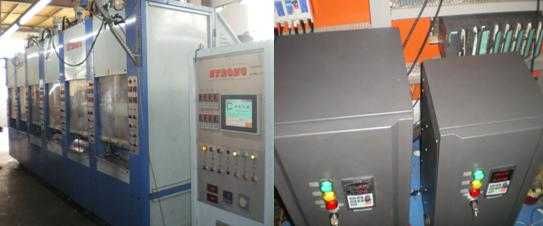 改造現(xiàn)場見下圖:(福州市臚雷工業(yè)區(qū)閩峰鞋業(yè)公司)15KW+18.5KW變頻器兩臺