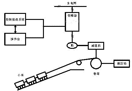 礦井提升機(jī)是煤礦,有色金屬礦生產(chǎn)過程中的重要設(shè)備。提升機(jī)的安全、可靠運(yùn)行,直接關(guān)系到企業(yè)的生產(chǎn)狀況和經(jīng)濟(jì)效益。山西某煤礦井下采煤,采好的煤通過斜井用提升機(jī)將煤車拖到地面上來。這種拖動系統(tǒng)要求電機(jī)頻繁的正、反轉(zhuǎn)起動,減速制動,而且電機(jī)的轉(zhuǎn)速一定規(guī)律變化。斜井提升機(jī)的機(jī)械結(jié)構(gòu)示意如下圖所示。斜井提升機(jī)的動力由繞線式電機(jī)提供,采用轉(zhuǎn)子串電阻調(diào)速。