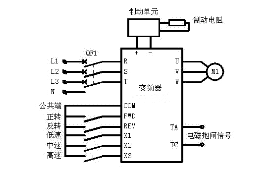 提升機(jī)傳統(tǒng)的操作方式為,操作工人坐在煤礦井口操作臺前,手握操縱桿控制電機(jī)正﹑反轉(zhuǎn)個三擋速度。為適應(yīng)操作工人這種操作方式,變頻器采用多段速度設(shè)置,F(xiàn)WD、REV設(shè)為正反轉(zhuǎn),X1、X2、X3設(shè)為低、中、高三擋速度。變頻調(diào)速原理圖如下圖所示。